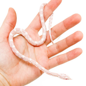 Mâle NC été 2025 disponible, photos non contractuelles "Albinos" x "Anérythristique": double récessif Les adultes peuvent parfois présenter du jaune sur le premier tiers du corps. Le fond de coloration est blanc avec des taches roses. Le damier de la face ventrale est présent mais dépigmenté.